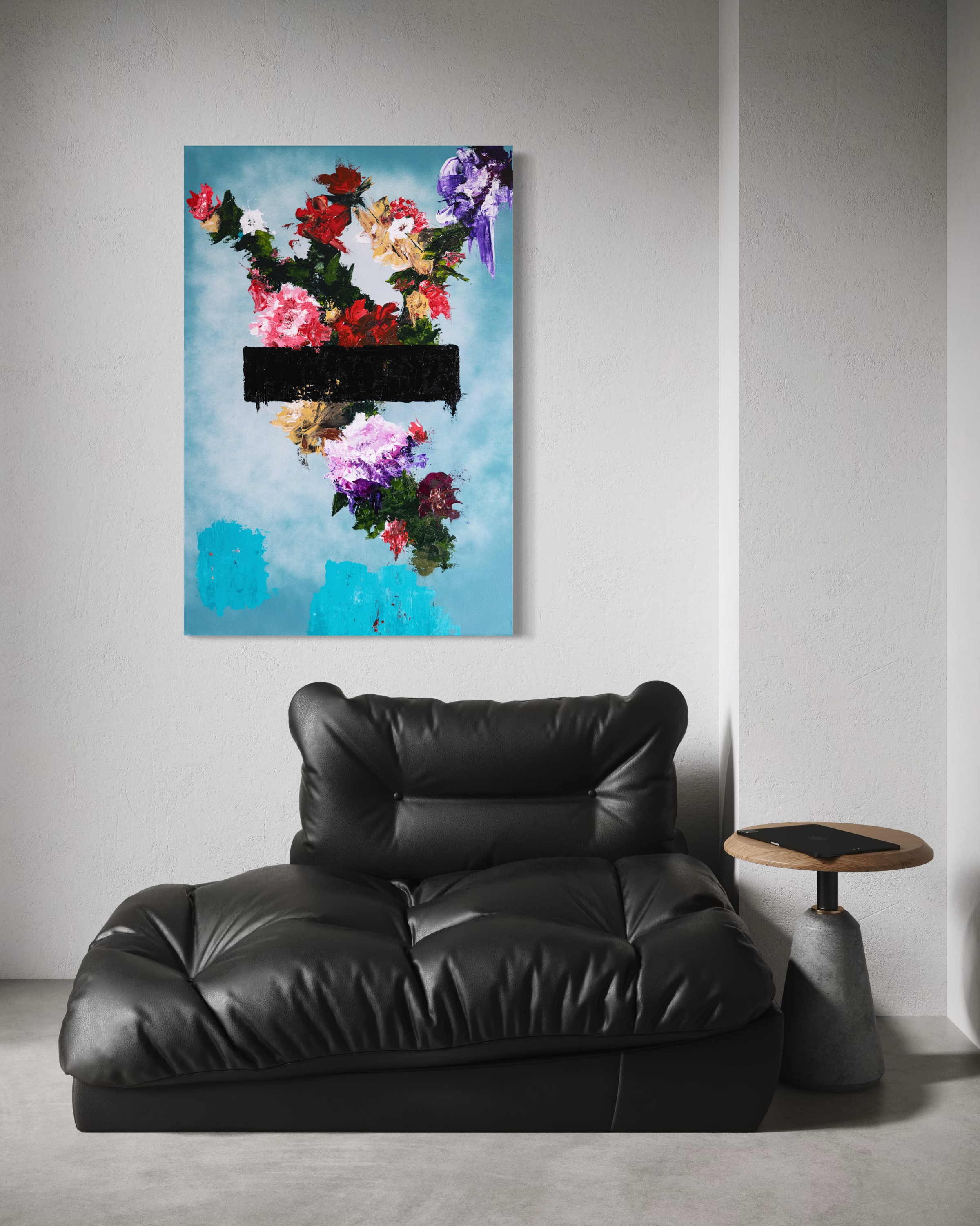 Built with a palette knife, the beauty and the damage come from the same hand, the same motion. The most honest part is in the near-match cover-ups. You can see the lie and how hard it works. The flowers survive underneath, the bar remains for now. Never mind.